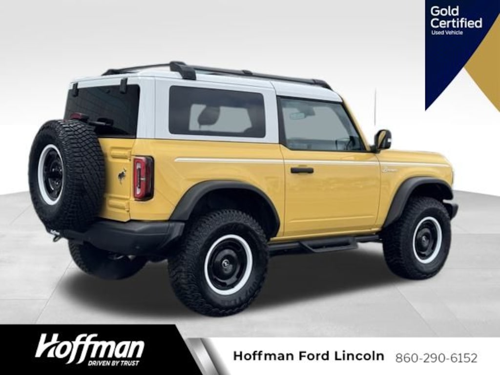 *Ford Certified*, Bronco Heritage Limited Edition, 2.7L EcoBoost V6, Yellowstone, 10 Speakers, 4-Wheel Disc Brakes, ABS brakes, Air Conditioning, AM/FM radio: SiriusXM with 360L, Auto High-beam Headlights, Auto-dimming Rear-View mirror, Automatic temperature control, Black Roof Rails w/Crossbars, Brake assist, Cargo Area Protector, Compass, Connected Navigation, Convertible HardTop, Convertible roof lining, Delay-off headlights, Driver door bin, Driver vanity mirror, Dual front impact airbags, Dual front side impact airbags, Electronic Stability Control, Emergency communication system: 911 Assist, Equipment Group 664A Lux Package, Exterior Parking Camera Rear, First Aid Kit, Front anti-roll bar, Front Bucket Seats, Front Center Armrest, Front dual zone A/C, Front License Plate Bracket, Front Row Top Panels & Door Storage Bags, Front wheel independent suspension, Garage door transmitter, Glass rear window, Heated door mirrors, Heated front seats, Illuminated entry, Integrated roll-over protection, Leather Shift Knob, Leather-Trimmed/Vinyl Heated Bucket Seats, Low tire pressure warning, Modular Roof Porthole Panel Roof Bag Storage (DIO), Navigation system: Connected Navigation, Occupant sensing airbag, Outside temperature display, Overhead airbag, Overhead console, Panic alarm, Passenger door bin, Passenger vanity mirror, Power door mirrors, Power steering, Power windows, Radio data system, Radio: B&O Sound System by Bang & Olufsen, Rear window defroster, Rear window wiper, Remote keyless entry, Security system, SiriusXM Radio w/360L, Split folding rear seat, Steering wheel mounted audio controls, SYNC 4, Tachometer, Telescoping steering wheel, Tilt steering wheel, Traction control, Trip computer, Turn signal indicator mirrors, Upgraded Carpet Floor Mats, Variably intermittent wipers, Voltmeter, Wheels: 17" Black High Gloss-Painted Aluminum.