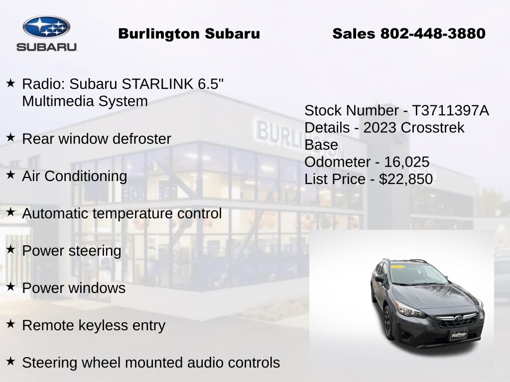 CARFAX One-Owner. Clean CARFAX. Subaru Crosstrek 2023 4-Wheel Disc Brakes, ABS brakes, Air Conditioning, Alloy wheels, Anti-whiplash front head restraints, Automatic temperature control, Brake assist, Driver vanity mirror, Dual front impact airbags, Dual front side impact airbags, Electronic Stability Control, Four wheel independent suspension, Front Bucket Seats, Front reading lights, Illuminated entry, Knee airbag, Low tire pressure warning, Occupant sensing airbag, Outside temperature display, Overhead airbag, Panic alarm, Passenger vanity mirror, Power door mirrors, Power steering, Power windows, Radio: Subaru STARLINK 6.5" Multimedia System, Rear window defroster, Rear window wiper, Remote keyless entry, Speed control, Speed-sensing steering, Split folding rear seat, STARLINK/Apple CarPlay/Android Auto, Steering wheel mounted audio controls, Tachometer, Telescoping steering wheel, Tilt steering wheel, Traction control, Trip computer, Variably intermittent wipers. Odometer is 20211 miles below market average!