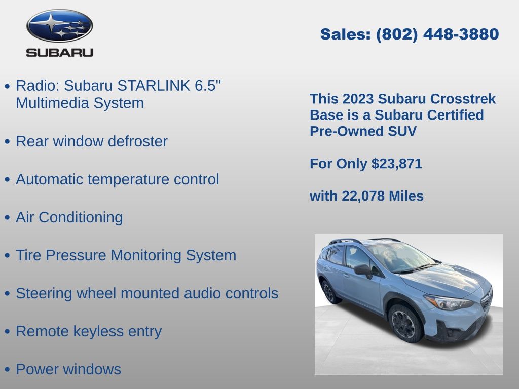 CARFAX One-Owner. Subaru Crosstrek 2023 4-Wheel Disc Brakes, ABS brakes, Air Conditioning, Alloy wheels, Anti-whiplash front head restraints, Automatic temperature control, Brake assist, Driver vanity mirror, Dual front impact airbags, Dual front side impact airbags, Electronic Stability Control, Exterior Parking Camera Rear, EyeSight System, Four wheel independent suspension, Front Bucket Seats, Front reading lights, High Grade Combination Meter w/Color LCD Display, Illuminated entry, Knee airbag, Low tire pressure warning, Occupant sensing airbag, Outside temperature display, Overhead airbag, Overhead console, Overhead Console Shower Light, Panic alarm, Passenger vanity mirror, Power door mirrors, Power steering, Power windows, Radio: Subaru STARLINK 6.5" Multimedia System, Rear Seat Reminder, Rear window defroster, Rear window wiper, Remote keyless entry, Speed control, Speed-sensing steering, Split folding rear seat, STARLINK/Apple CarPlay/Android Auto, Steering wheel mounted audio controls, Tachometer, Telescoping steering wheel, Tilt steering wheel, Tire Pressure Monitoring System, Traction control, Trip computer, Variably intermittent wipers. Odometer is 2746 miles below market average!