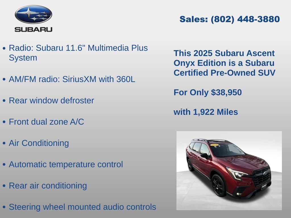 Clean CARFAX. Subaru Ascent Onyx Edition 2025 Certified. 4-Wheel Disc Brakes, ABS brakes, Air Conditioning, Alloy wheels, AM/FM radio: SiriusXM with 360L, Apple CarPlay & Android Auto, Auto High-beam Headlights, Auto-dimming Rear-View mirror, Automatic temperature control, Brake assist, Compass, Delay-off headlights, Driver vanity mirror, Dual front impact airbags, Dual front side impact airbags, Electronic Stability Control, Emergency communication system: MySubaru Safety (3-year free trial), Exterior Parking Camera Rear, Four wheel independent suspension, Front dual zone A/C, Front fog lights, Front reading lights, Fully automatic headlights, Garage door transmitter: HomeLink, Heated door mirrors, Heated Front Bucket Seats, Heated steering wheel, Illuminated entry, Knee airbag, Leather Shift Knob, Leather steering wheel, Low tire pressure warning, Occupant sensing airbag, Outside temperature display, Overhead airbag, Panic alarm, Passenger vanity mirror, Power door mirrors, Power driver seat, Power Liftgate, Power moonroof, Power steering, Power windows, Radio: Subaru 11.6" Multimedia Plus System, Rear air conditioning, Rear reading lights, Rear window defroster, Rear window wiper, Reclining 3rd row seat, Remote keyless entry, Speed control, Speed-sensing steering, Split folding rear seat, StarTex Upholstery, Steering wheel mounted audio controls, Tachometer, Telescoping steering wheel, Tilt steering wheel, Traction control, Trip computer, Turn signal indicator mirrors, Variably intermittent wipers. Odometer is 6325 miles below market average!