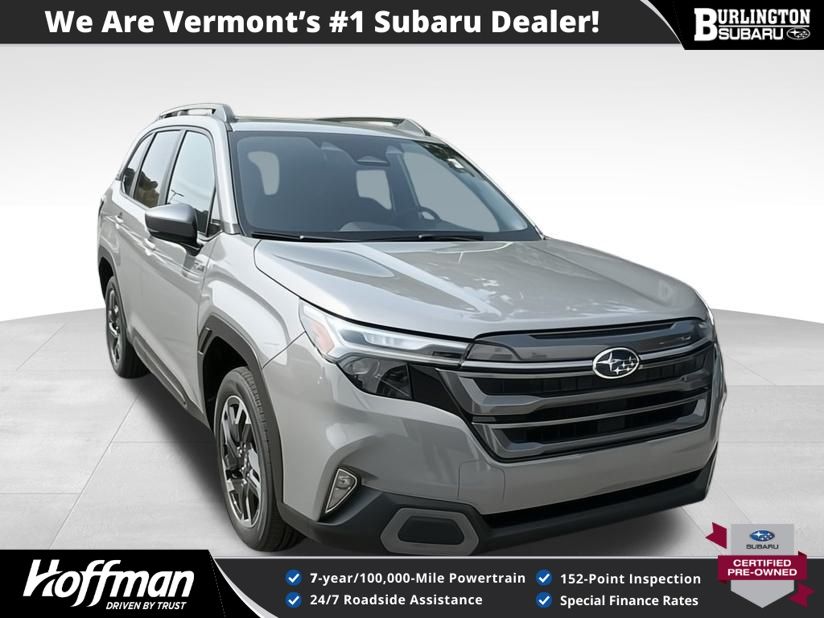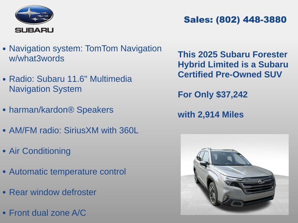 Clean CARFAX. Subaru Forester Hybrid Limited 2025 Certified. 4-Wheel Disc Brakes, ABS brakes, Air Conditioning, Alloy wheels, AM/FM radio: SiriusXM with 360L, Anti-whiplash front head restraints, Auto High-beam Headlights, Automatic temperature control, Brake assist, Compass, Driver vanity mirror, Dual front impact airbags, Dual front side impact airbags, Electronic Stability Control, Emergency communication system: MySubaru Safety (3-year free trial), Exterior Parking Camera Rear, Four wheel independent suspension, Front dual zone A/C, Front fog lights, Front reading lights, Fully automatic headlights, harman/kardon® Speakers, Heated door mirrors, Heated Front Bucket Seats, Illuminated entry, Knee airbag, Low tire pressure warning, Navigation system: TomTom Navigation w/what3words, Occupant sensing airbag, Outside temperature display, Overhead airbag, Overhead console, Panic alarm, Passenger vanity mirror, Power door mirrors, Power driver seat, Power Liftgate, Power moonroof: Panoramic, Power passenger seat, Power steering, Power windows, Radio: Subaru 11.6" Multimedia Navigation System, Rear window defroster, Rear window wiper, Remote keyless entry, Speed control, Speed-sensing steering, Split folding rear seat, StarTex Upholstery, Steering wheel mounted audio controls, Tachometer, Telescoping steering wheel, Tilt steering wheel, Traction control, Trip computer, Turn signal indicator mirrors, Variably intermittent wipers. Odometer is 998 miles below market average!