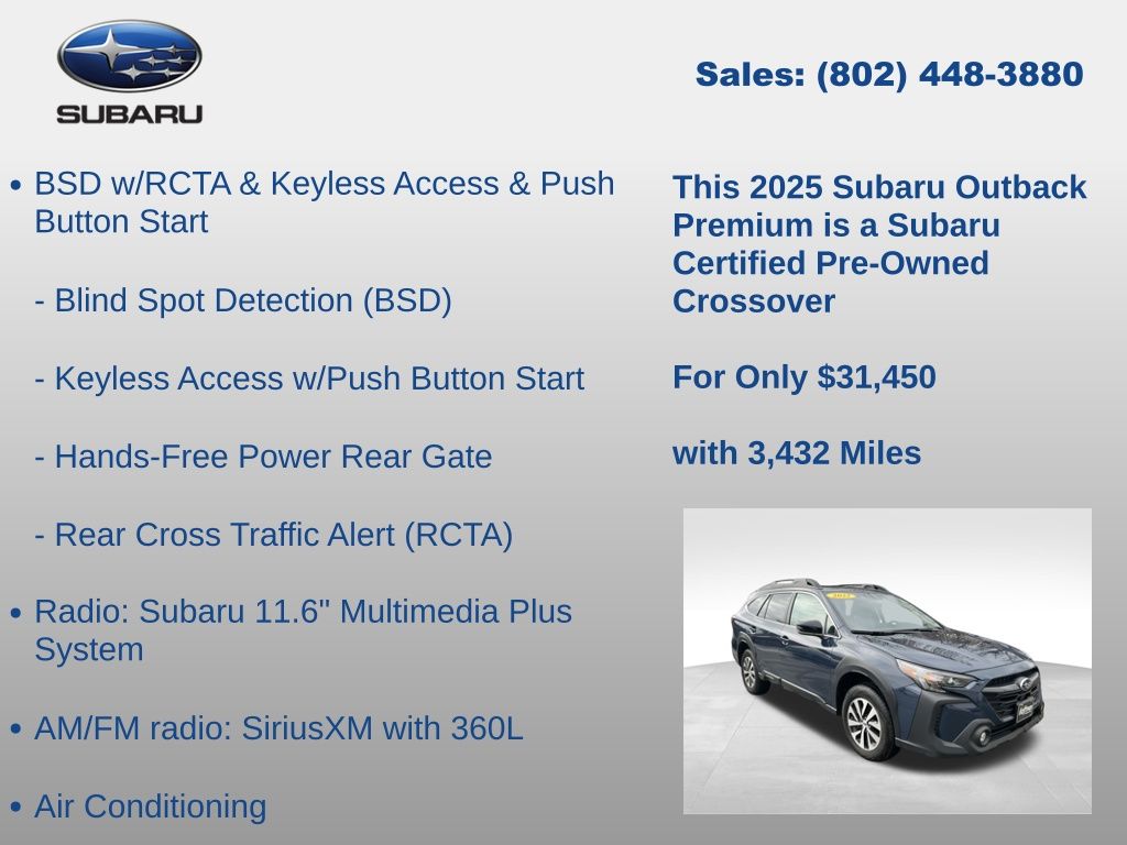 Clean CARFAX. Subaru Outback Premium 2025 Certified. 4-Wheel Disc Brakes, ABS brakes, Air Conditioning, Alloy wheels, AM/FM radio: SiriusXM with 360L, Apple CarPlay & Android Auto, Auto High-beam Headlights, Automatic temperature control, Blind Spot Detection (BSD), Brake assist, BSD w/RCTA & Keyless Access & Push Button Start, Driver vanity mirror, Dual front impact airbags, Dual front side impact airbags, Electronic Stability Control, Emergency communication system: MySubaru Safety (3-year free trial), Exterior Parking Camera Rear, Four wheel independent suspension, Front dual zone A/C, Front fog lights, Front reading lights, Fully automatic headlights, Hands-Free Power Rear Gate, Heated door mirrors, Heated Front Bucket Seats, Illuminated entry, Keyless Access w/Push Button Start, Knee airbag, Leather Shift Knob, Leather steering wheel, Low tire pressure warning, Occupant sensing airbag, Outside temperature display, Overhead airbag, Overhead console, Panic alarm, Passenger vanity mirror, Power door mirrors, Power driver seat, Power steering, Power windows, Radio: Subaru 11.6" Multimedia Plus System, Rear Cross Traffic Alert (RCTA), Rear window defroster, Rear window wiper, Remote keyless entry, Speed control, Speed-sensing steering, Split folding rear seat, Steering wheel mounted audio controls, Tachometer, Telescoping steering wheel, Tilt steering wheel, Traction control, Trip computer, Turn signal indicator mirrors, Variably intermittent wipers. Odometer is 3192 miles below market average!