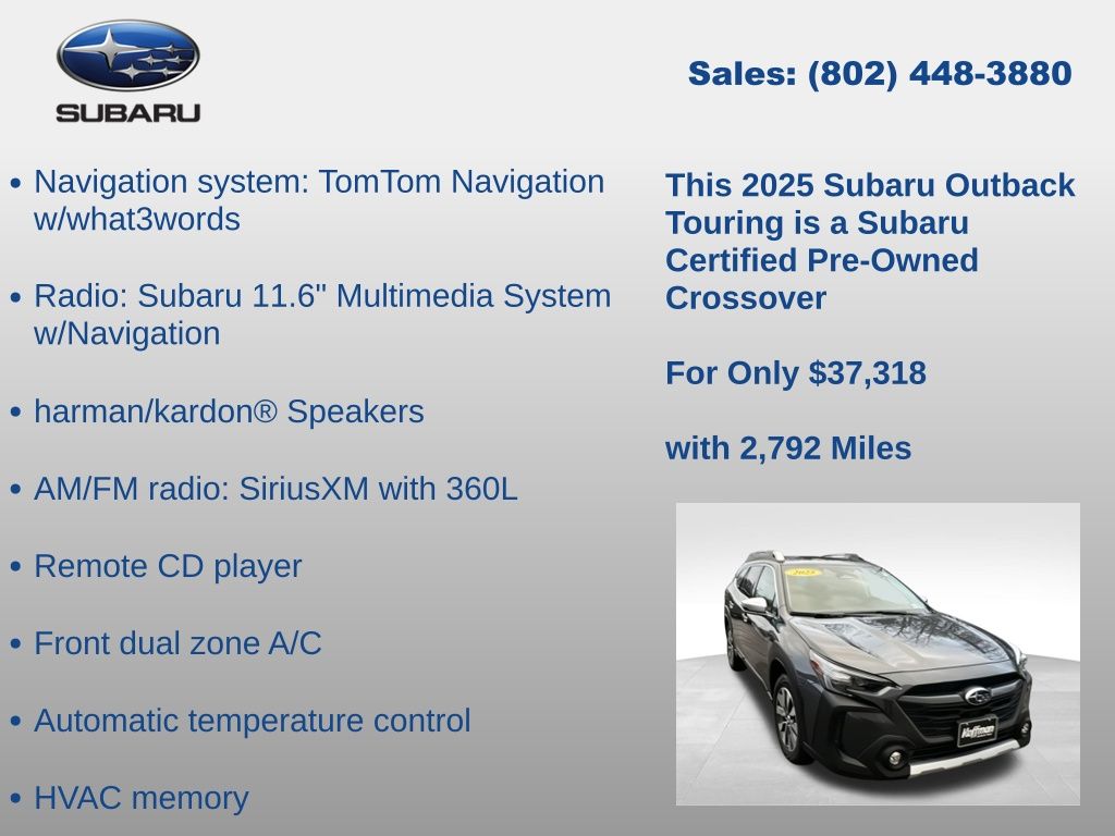 Clean CARFAX. Subaru Outback Touring 2025 Certified. 4-Wheel Disc Brakes, ABS brakes, Air Conditioning, Alloy wheels, AM/FM radio: SiriusXM with 360L, Apple CarPlay & Android Auto, Auto High-beam Headlights, Auto-dimming Rear-View mirror, Automatic temperature control, Brake assist, Compass, Driver vanity mirror, Dual front impact airbags, Dual front side impact airbags, Electronic Stability Control, Emergency communication system: MySubaru Safety (3-year free trial), Exterior Parking Camera Rear, Four wheel independent suspension, Front Center Armrest w/Storage, Front dual zone A/C, Front fog lights, Front reading lights, Fully automatic headlights, Garage door transmitter: HomeLink, harman/kardon® Speakers, Heated & Ventilated Front Bucket Seats, Heated door mirrors, Heated steering wheel, HVAC memory, Illuminated entry, Knee airbag, Leather Shift Knob, Leather steering wheel, Low tire pressure warning, Memory seat, Navigation system: TomTom Navigation w/what3words, Occupant sensing airbag, Outside temperature display, Overhead airbag, Panic alarm, Passenger vanity mirror, Perforated Nappa Leather-Trimmed Upholstery, Power door mirrors, Power driver seat, Power Liftgate, Power moonroof, Power passenger seat, Power steering, Power windows, Radio: Subaru 11.6" Multimedia System w/Navigation, Rear window defroster, Rear window wiper, Remote CD player, Remote keyless entry, Speed control, Speed-sensing steering, Split folding rear seat, Steering wheel mounted audio controls, Tachometer, Telescoping steering wheel, Tilt steering wheel, Traction control, Trip computer, Turn signal indicator mirrors, Variably intermittent wipers, Ventilated front seats. Odometer is 3437 miles below market average!
