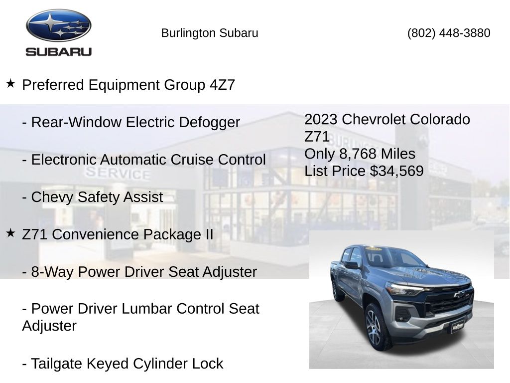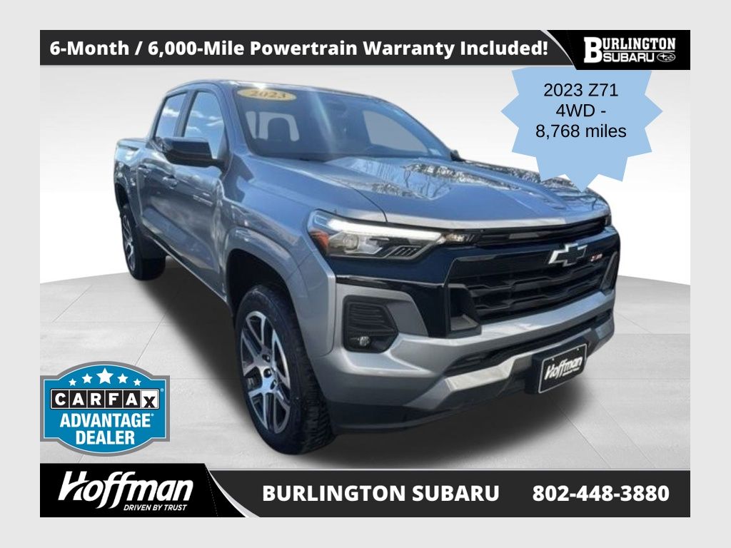 Clean CARFAX. Chevrolet Colorado Z71 2023 4-Way Manual Passenger Seat Adjuster, 4-Wheel Disc Brakes, 6-Speaker Audio System Feature, 6-Way Manual Driver Seat Adjuster, 8-Way Power Driver Seat Adjuster, ABS brakes, Air Conditioning, Alloy wheels, Apple CarPlay/Android Auto, Auto High-beam Headlights, Automatic Emergency Braking, Brake assist, Chevy Safety Assist, Compass, Delay-off headlights, Driver vanity mirror, Dual front impact airbags, Dual front side impact airbags, Dual-Zone Automatic Air Conditioning, Electronic Automatic Cruise Control, Electronic Stability Control, EZ-Lift & Lower Tailgate, Following Distance Indicator, Forward Collision Alert, Front anti-roll bar, Front Bucket Seats, Front fog lights, Front Pedestrian & Bicyclist Braking, Front reading lights, Front wheel independent suspension, Heated door mirrors, Heated Driver & Front Passenger Seats, Illuminated entry, Inside Rear-View Auto-Dimming Mirror, IntelliBeam Automatic High Beam On/Off, Lane Keep Assist w/Lane Departure Warning, Low tire pressure warning, Navigation System, Occupant sensing airbag, Outside temperature display, Overhead airbag, Overhead console, Panic alarm, Passenger vanity mirror, Power door mirrors, Power Driver Lumbar Control Seat Adjuster, Power steering, Power windows, Preferred Equipment Group 4Z7, Radio: 11.3" Diagonal Advanced Color LCD Display, Rear reading lights, Rear window defroster, Rear-Window Electric Defogger, Remote keyless entry, Remote Vehicle Starter System, SiriusXM Radio, Speed control, Speed-sensing steering, Steering Wheel Mounted Audio Controls, Steering wheel mounted audio controls, StowFlex Tailgate Storage Compartment, Tachometer, Tailgate Keyed Cylinder Lock, Tilt & Telescoping Steering Column, Tilt steering wheel, Traction control, Trip computer, Variably intermittent wipers, Wheels: 20" x 9" Dark Android Aluminum, Wireless Charging, Wireless Phone Projection, Z71 Convenience Package II. Odometer is 20059 miles below market average!