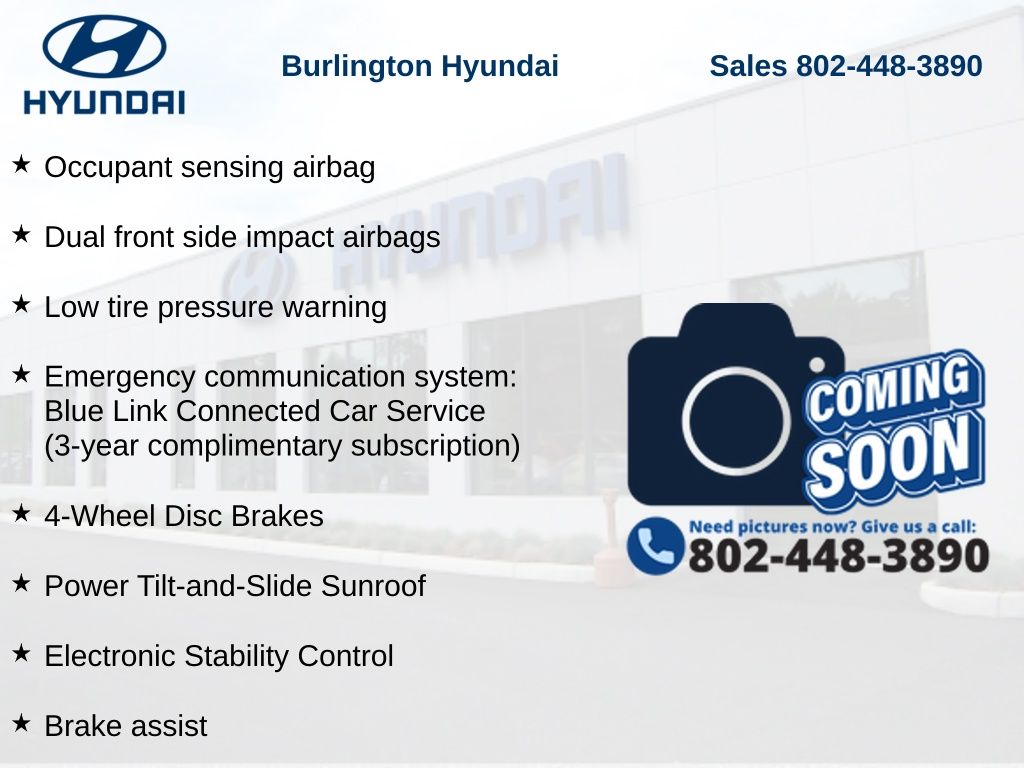 4-Wheel Disc Brakes, ABS brakes, Air Conditioning, Alloy wheels, Apple CarPlay & Android Auto, Automatic Temperature Control, Brake assist, Delay-off headlights, Driver vanity mirror, Dual front impact airbags, Dual front side impact airbags, Electronic Stability Control, Emergency communication system: Blue Link Connected Car Service (3-year complimentary subscription), Exterior Parking Camera Rear, Four wheel independent suspension, Front Bucket Seats, Front reading lights, Fully automatic headlights, Heated door mirrors, Heated Front Seats, Hyundai Digital Key, Illuminated entry, Leather-Wrapped Shift Knob, Leather-Wrapped Steering Wheel, Low tire pressure warning, Occupant sensing airbag, Outside temperature display, Overhead airbag, Panic alarm, Passenger vanity mirror, Power door mirrors, Power driver seat, Power steering, Power Tilt-and-Slide Sunroof, Power windows, Radio: AM/FM/SiriusXM/HD Audio System, Rear window defroster, Rear window wiper, Remote keyless entry, Speed control, Speed-sensing steering, Split folding rear seat, Steering wheel mounted audio controls, Tachometer, Telescoping steering wheel, Tilt steering wheel, Traction control, Trip computer, Turn signal indicator mirrors, Variably intermittent wipers, Wireless Device Charging.