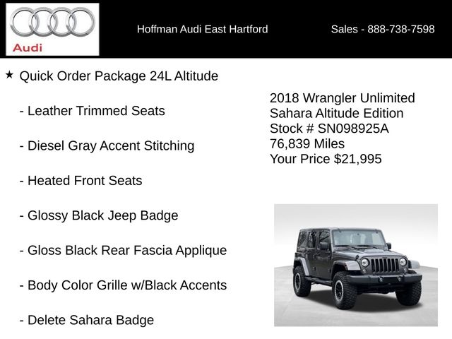 ONE OWNER, CLEAN CARFAX...NO ACCIDENTS, INCLUDES WARRANTY, 6 MONTHS/6000 MILES POWERTRAIN WARRANTY, 18" x 7.5" Polished Satin Carbon Wheels, 3.73 Rear Axle Ratio, 4-Wheel Disc Brakes, 40GB Hard Drive w/28GB Available, 5-Year SiriusXM Travel Link Service, 6.5" Touchscreen Display, 8 Speakers, ABS brakes, Air Conditioning, Air Conditioning w/Auto Temperature Control, Air Filtering, Alloy wheels, Alpine 9-Speaker w/All Weather Subwoofer, Altitude Package, AM/FM radio: SiriusXM, Audio Jack Input for Mobile Devices, Auto-dimming Rear-View mirror, Black/Chrome Screws Fuel Filler Door, Body Color 3-Piece Hard Top, Body Color Grille w/Black Accents, Brake assist, CD player, Class II Receiver Hitch, Cloth Seats w/Adjustable Head Restraints, Compass, Connectivity Group, Delete Sahara Badge, Diesel Gray Accent Stitching, Driver door bin, Driver Height Adjuster Seat, Driver vanity mirror, Dual front impact airbags, Electronic Stability Control, Front anti-roll bar, Front Bucket Seats, Front Center Armrest w/Storage, Front fog lights, Front reading lights, Front Seat Back Map Pockets, Fully automatic headlights, Gloss Black Rear Fascia Applique, Glossy Black Jeep Badge, GPS Navigation, Heated door mirrors, Heated Front Seats, Heavy Duty Suspension w/Gas Shocks, Hood w/Power Bulge, Humidity Sensor, Illuminated entry, Integrated roll-over protection, Leather steering wheel, Leather Trimmed Seats, Liquid Titanium Accents, Low Gloss Wrangler JK Decal, Low tire pressure warning, Max Tow Package, Millennium Fabric Sport Bar Cover, MOPAR Black Tail Lamp Guards, MOPAR Grab Handles, Occupant sensing airbag, Outside temperature display, Panic alarm, Passenger door bin, Passenger vanity mirror, Power door mirrors, Power steering, Power windows, Quick Order Package 24L Altitude, R1234YF A/C Refrigerant, Radio data system, Radio: 130, Radio: 430 Nav, Rear anti-roll bar, Remote keyless entry, Remote Start System, Remote USB Port, Security system, SiriusXM Travel Link, Speed control, Split folding rear seat, Steering wheel mounted audio controls, Tachometer, Tilt steering wheel, Tire Pressure Monitoring Display, Traction control, Trailer Tow w/4-Pin Connector Wiring, Trip computer, Uconnect Voice Command w/Bluetooth, Variably intermittent wipers, Vehicle Information Center, Wheels: 18" x 7.5" High Gloss Black Polished. CARFAX One-Owner. Clean CARFAX. Granite Crystal Metallic Clearcoat 2018 Jeep Wrangler JK Unlimited Altitude 4WD 5-Speed Automatic 3.6L V6 24V VVT