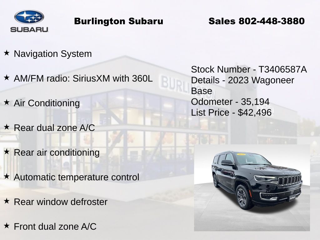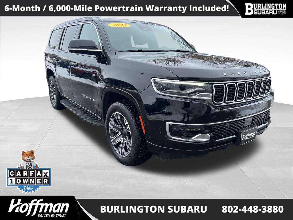 CARFAX One-Owner. Jeep Wagoneer 2023 3rd row seats: bench, 4-Wheel Disc Brakes, ABS brakes, Active Lane Management System, Adjustable pedals, Adjustable Roof Rail Crossbars, Air Conditioning, Alloy wheels, AM/FM radio: SiriusXM with 360L, Anti-whiplash front head restraints, Auto-dimming door mirrors, Auto-dimming Rear-View mirror, Auto-leveling suspension, Automatic temperature control, Brake assist, Compass, Delay-off headlights, Driver vanity mirror, Driver's Seat Mounted Armrest, Dual front impact airbags, Dual front side impact airbags, Electronic Stability Control, Emergency communication system: Automatic SOS Call, Exterior Parking Camera Rear, Four wheel independent suspension, Front anti-roll bar, Front dual zone A/C, Front fog lights, Front Passenger Interactive Display, Front reading lights, Fully automatic headlights, Garage door transmitter, Heated door mirrors, Heated front seats, Heated steering wheel, Illuminated entry, Knee airbag, Leather Trimmed Bucket Seats, Low tire pressure warning, Memory seat, Navigation System, Normal Duty Suspension, Occupant sensing airbag, Outside temperature display, Overhead airbag, P&P Park & Unpark Assist w/Stop System, Panic alarm, Passenger seat mounted armrest, Passenger vanity mirror, Pedal memory, Power adjustable front head restraints, Power door mirrors, Power driver seat, Power Liftgate, Power passenger seat, Power steering, Power windows, Rain Sensitive Windshield Wipers, Rear air conditioning, Rear dual zone A/C, Rear reading lights, Rear window defroster, Rear window wiper, Reclining 3rd row seat, Remote keyless entry, Reversible Carpet/Vinyl Cargo Mat, Side Distance Warning, Speed control, Speed-sensing steering, Speed-Sensitive Wipers, Split folding rear seat, Steering wheel memory, Steering wheel mounted audio controls, Surround View Camera System, Tachometer, Telescoping steering wheel, Tilt steering wheel, Traction control, Trip computer, Turn signal indicator mirrors, Variably intermittent wipers, Ventilated front seats, Voltmeter.