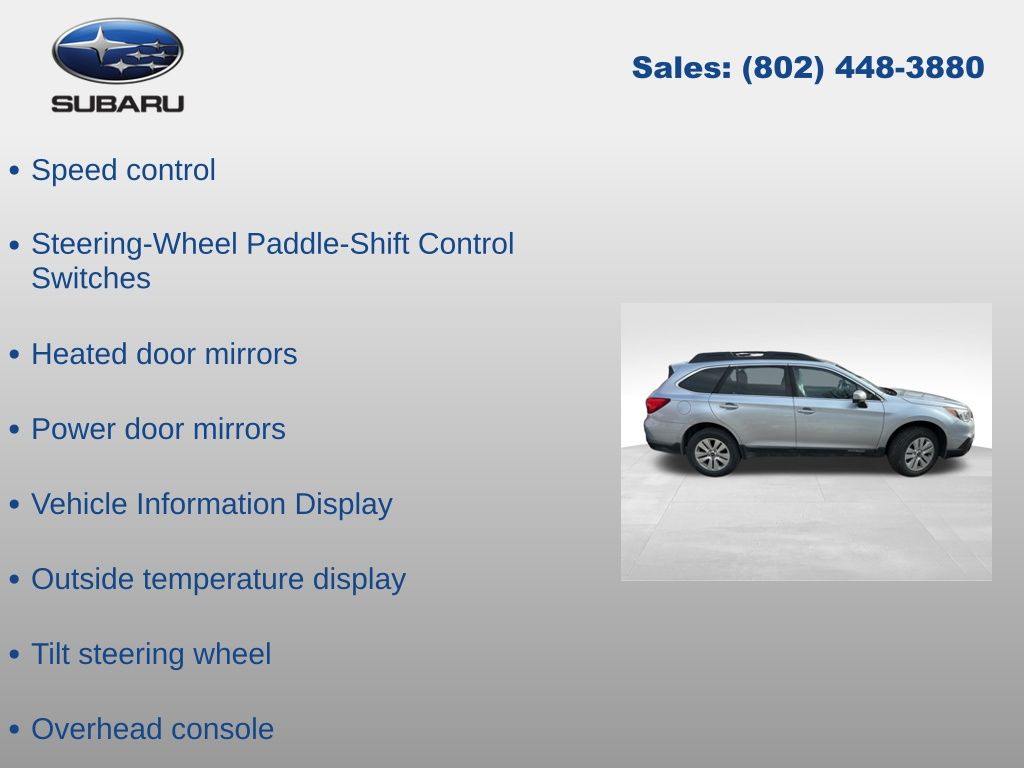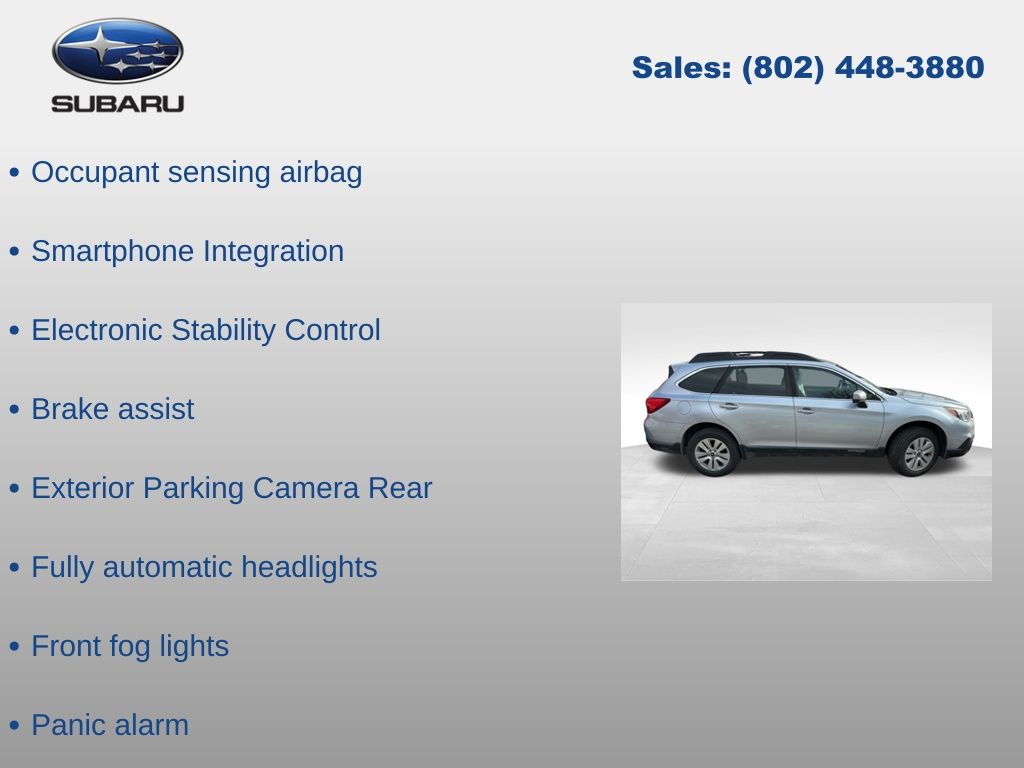 CARFAX One-Owner. Clean CARFAX. Subaru Outback 2.5i Premium 2017 4-Wheel Disc Brakes, ABS brakes, Aha, Air Conditioning, Alloy wheels, AM/FM radio: SiriusXM, Anti-whiplash front head restraints, Automatic temperature control, Brake assist, CD player, Driver vanity mirror, Dual front impact airbags, Dual front side impact airbags, Electronic Stability Control, Emergency communication system, Exterior Parking Camera Rear, Four wheel independent suspension, Front dual zone A/C, Front fog lights, Front reading lights, Fully automatic headlights, Heated door mirrors, Heated Reclining Front Bucket Seats, Illuminated entry, Leather Shift Knob, Low tire pressure warning, Occupant sensing airbag, Outside temperature display, Overhead airbag, Overhead console, Panic alarm, Passenger vanity mirror, Power door mirrors, Power driver seat, Power steering, Power windows, Radio: Subaru Starlink 7.0" Multimedia Plus System, Rear window defroster, Rear window wiper, Remote keyless entry, Smartphone Integration, Speed control, Speed-sensing steering, Split folding rear seat, Steering wheel mounted audio controls, Steering-Wheel Paddle-Shift Control Switches, Tachometer, Telescoping steering wheel, Tilt steering wheel, Traction control, Trip computer, Variably intermittent wipers, Vehicle Information Display. Odometer is 20911 miles below market average!