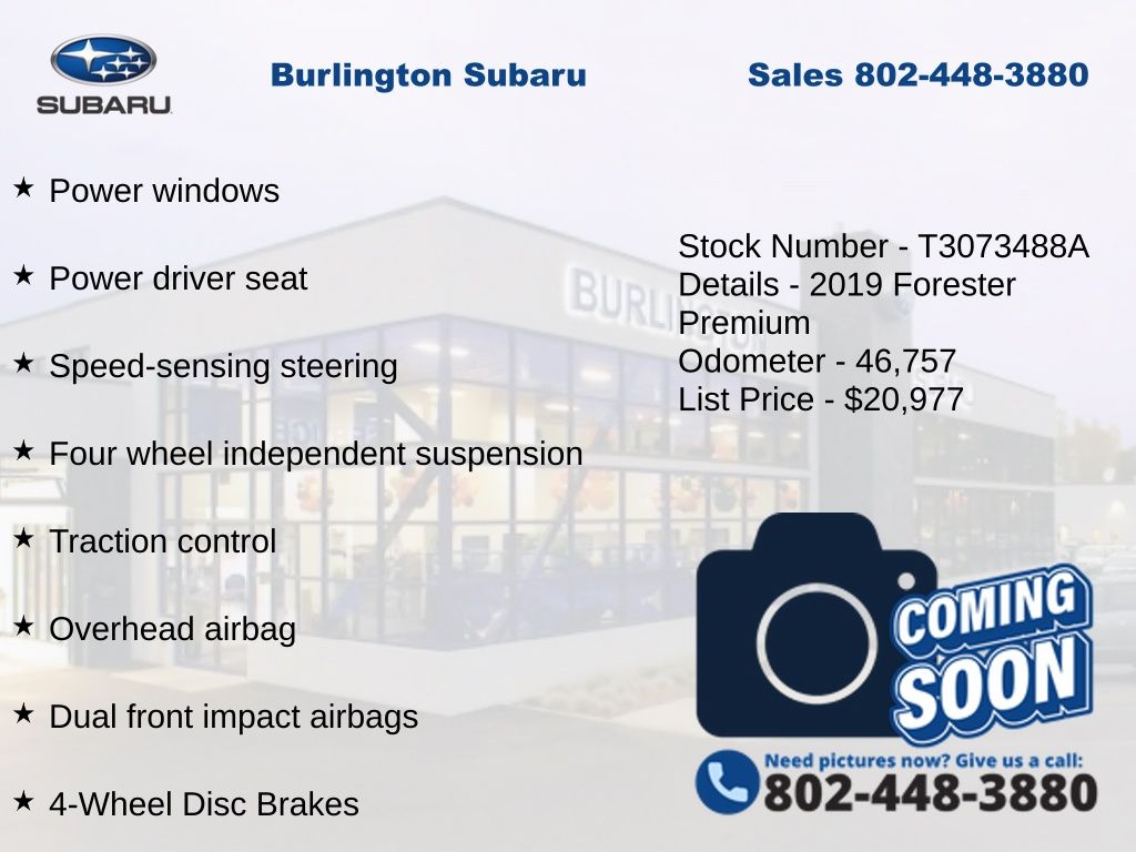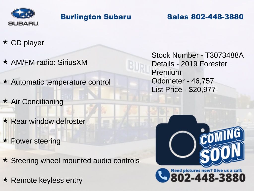 Clean CARFAX. Subaru Forester Premium 2019 4-Wheel Disc Brakes, ABS brakes, Air Conditioning, Alloy wheels, AM/FM radio: SiriusXM, Automatic temperature control, Brake assist, CD player, Driver vanity mirror, Dual front impact airbags, Dual front side impact airbags, Electronic Stability Control, Emergency communication system: STARLINK Safety and Security, Exterior Parking Camera Rear, Four wheel independent suspension, Front Bucket Seats, Front reading lights, Fully automatic headlights, Heated Exterior Mirrors, Heated Front Seats, Illuminated entry, Knee airbag, Low tire pressure warning, Occupant sensing airbag, Outside temperature display, Overhead airbag, Panic alarm, Passenger vanity mirror, Power door mirrors, Power driver seat, Power moonroof: Panoramic, Power steering, Power windows, Rear window defroster, Rear window wiper, Remote keyless entry, Speed control, Speed-sensing steering, Split folding rear seat, STARLINK/Apple CarPlay/Android Auto, Steering wheel mounted audio controls, Tachometer, Telescoping steering wheel, Tilt steering wheel, Traction control, Variably intermittent wipers, Windshield Wiper De-Icer. Odometer is 25152 miles below market average!