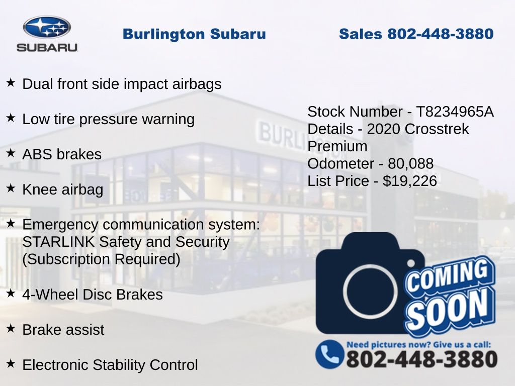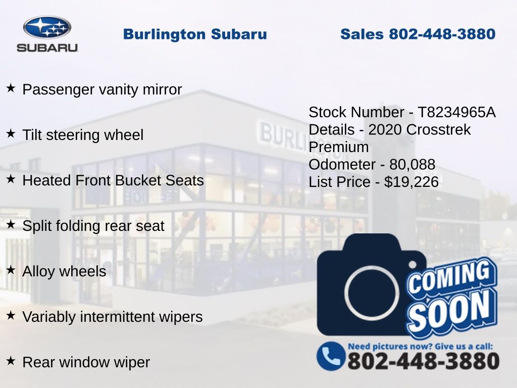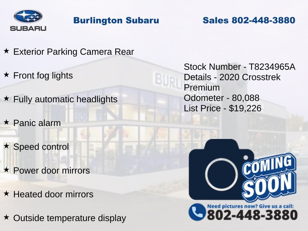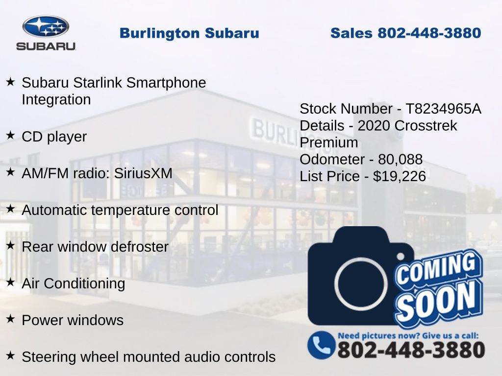 CARFAX One-Owner. Clean CARFAX. Subaru Crosstrek Premium 2020 4-Wheel Disc Brakes, ABS brakes, Air Conditioning, Alloy wheels, AM/FM radio: SiriusXM, Automatic temperature control, Brake assist, CD player, Driver vanity mirror, Dual front impact airbags, Dual front side impact airbags, Electronic Stability Control, Emergency communication system: STARLINK Safety and Security (Subscription Required), Exterior Parking Camera Rear, Four wheel independent suspension, Front fog lights, Front reading lights, Fully automatic headlights, Heated door mirrors, Heated Front Bucket Seats, Illuminated entry, Knee airbag, Low tire pressure warning, Occupant sensing airbag, Outside temperature display, Overhead airbag, Overhead console, Panic alarm, Passenger vanity mirror, Power door mirrors, Power steering, Power windows, Rear window defroster, Rear window wiper, Remote keyless entry, Speed control, Speed-sensing steering, Split folding rear seat, STARLINK/Apple CarPlay/Android Auto, Steering wheel mounted audio controls, Subaru Starlink Smartphone Integration, Tachometer, Telescoping steering wheel, Tilt steering wheel, Traction control, Trip computer, Variably intermittent wipers.