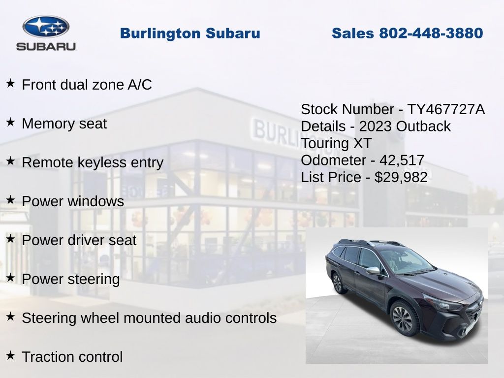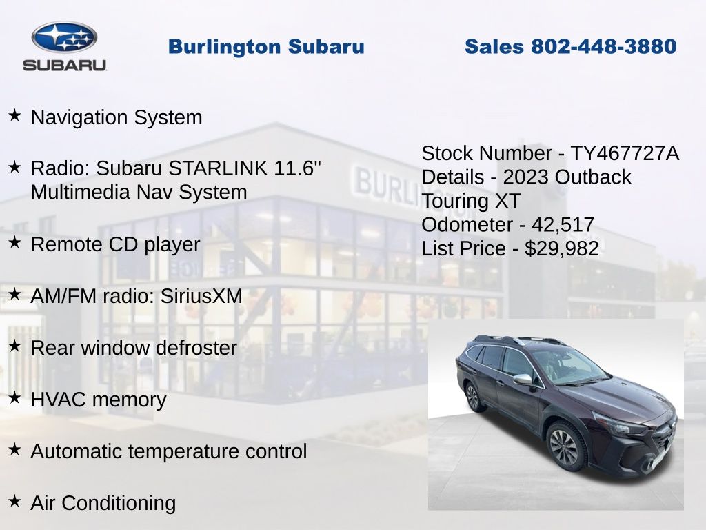 CARFAX One-Owner. Clean CARFAX. Subaru Outback Touring XT 2023 4-Wheel Disc Brakes, ABS brakes, Air Conditioning, Alloy wheels, AM/FM radio: SiriusXM, Auto High-beam Headlights, Auto-dimming Rear-View mirror, Automatic temperature control, Brake assist, Compass, Driver vanity mirror, Dual front impact airbags, Dual front side impact airbags, Electronic Stability Control, Emergency communication system: STARLINK Safety Plus (3-year free trial), Exterior Parking Camera Rear, Four wheel independent suspension, Front dual zone A/C, Front fog lights, Front reading lights, Fully automatic headlights, Garage door transmitter: HomeLink, Heated & Ventilated Front Bucket Seats, Heated door mirrors, Heated steering wheel, HVAC memory, Illuminated entry, Knee airbag, Leather Shift Knob, Leather steering wheel, Low tire pressure warning, Memory seat, Navigation System, Occupant sensing airbag, Outside temperature display, Overhead airbag, Panic alarm, Passenger vanity mirror, Perforated Nappa Leather-Trimmed Upholstery, Power door mirrors, Power driver seat, Power Liftgate, Power moonroof, Power passenger seat, Power steering, Power windows, Radio: Subaru STARLINK 11.6" Multimedia Nav System, Rear window defroster, Rear window wiper, Remote CD player, Remote keyless entry, Speed control, Speed-sensing steering, Split folding rear seat, Steering wheel mounted audio controls, Steering Wheel Paddle Shift Control Switches, Tachometer, Telescoping steering wheel, Tilt steering wheel, Traction control, Trip computer, Turn signal indicator mirrors, Variably intermittent wipers, Ventilated front seats.