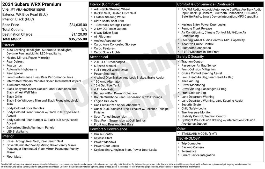 Clean CARFAX. Subaru WRX Premium 2024