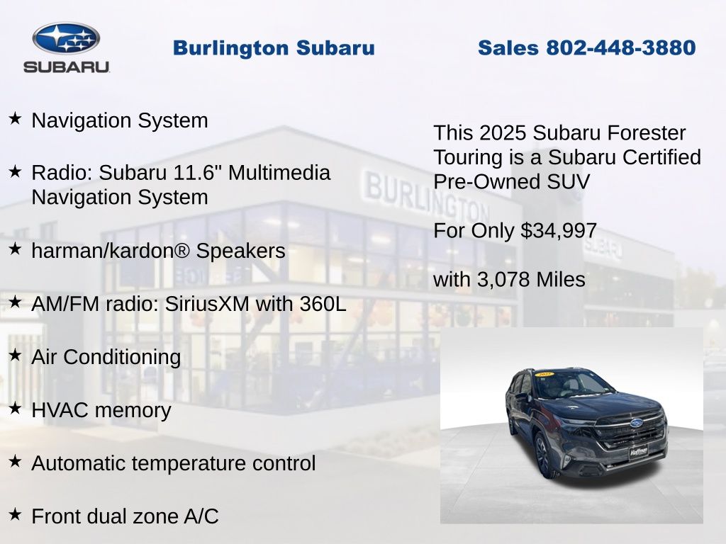 Clean CARFAX. Subaru Forester Touring 2025 Certified. 4-Wheel Disc Brakes, ABS brakes, Air Conditioning, Alloy wheels, AM/FM radio: SiriusXM with 360L, Anti-whiplash front head restraints, Auto High-beam Headlights, Automatic temperature control, Brake assist, Driver vanity mirror, Dual front impact airbags, Dual front side impact airbags, Electronic Stability Control, Emergency communication system: MySubaru Safety (3-year free trial), Exterior Parking Camera Rear, Four wheel independent suspension, Front dual zone A/C, Front fog lights, Front reading lights, Fully automatic headlights, harman/kardon® Speakers, Heated & Ventilated Front Bucket Seats, Heated door mirrors, Heated rear seats, Heated steering wheel, HVAC memory, Illuminated entry, Knee airbag, Leather steering wheel, Low tire pressure warning, Memory seat, Navigation System, Occupant sensing airbag, Outside temperature display, Overhead airbag, Overhead console, Panic alarm, Passenger vanity mirror, Perforated Leather-Trimmed Upholstery, Power door mirrors, Power driver seat, Power Liftgate, Power moonroof: Panoramic, Power passenger seat, Power steering, Power windows, Radio: Subaru 11.6" Multimedia Navigation System, Rear window defroster, Rear window wiper, Remote keyless entry, Speed control, Speed-sensing steering, Split folding rear seat, Steering wheel mounted audio controls, Tachometer, Telescoping steering wheel, Tilt steering wheel, Traction control, Trip computer, Turn signal indicator mirrors, Variably intermittent wipers, Ventilated front seats. Odometer is 5877 miles below market average!